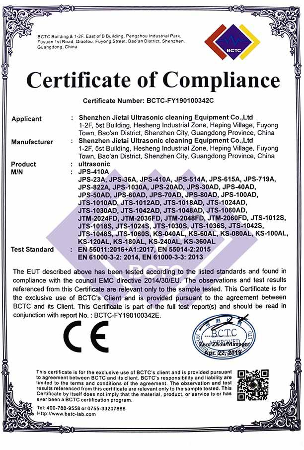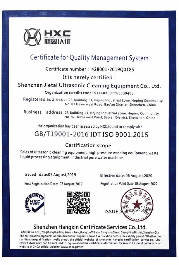 ? ? ? 公司全面實行嚴格的ISO9001:2008質量體系管理,以創新著稱而躋身行業前列,所開發生產的各種超聲波清洗設備,先后通過CE、FCC、ROHS、等認證,產品專利達50多項,技術達國際同類產品先進水平。