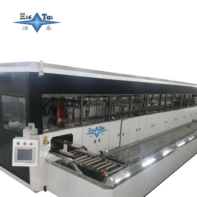 潔泰龍門臂超聲波清洗機,是一款全自動,清洗過程由微控控制,5個由SUS316材質制作的清洗槽,漂洗槽、烘干槽組成的一條連續工作的裝置。操作者將裝有工件的清洗籃放置在進料輸送滾道上,輸送滾道將清洗籃送往上料工位,機械手依次將清洗籃送往各清洗槽,對工件進展熱浸洗、超聲粗洗、超聲精洗、蒸汽浴洗及熱風烘干,第一到五槽的熱浸洗、超聲波粗洗、超聲波精洗、蒸汽浴洗、熱風烘干過程中,清洗籃旋轉機構使清洗藍始終處于旋轉狀態,使工件充分得到清洗,提升過程中洗籃也始終處于旋轉狀態,并在冷凍區停留一段時間,使清洗液脫離工件流回清洗槽,工件橫移機構負責將工件挪動一個工位,出料輸送滾道將清洗好的工件送往出口,操作者在出口處將工件卸下,翻開洗籃將工件道入器皿,清洗既告完成。